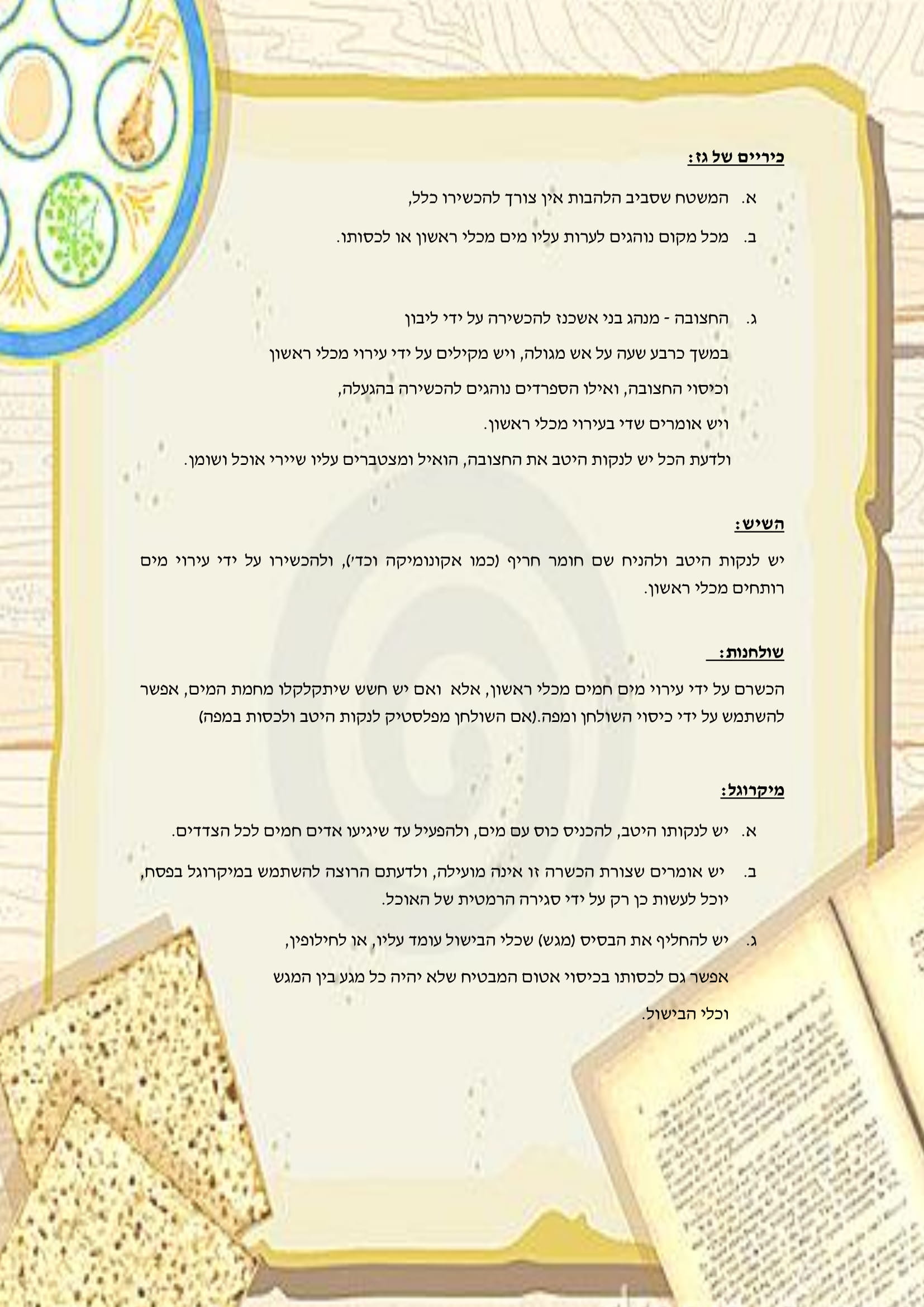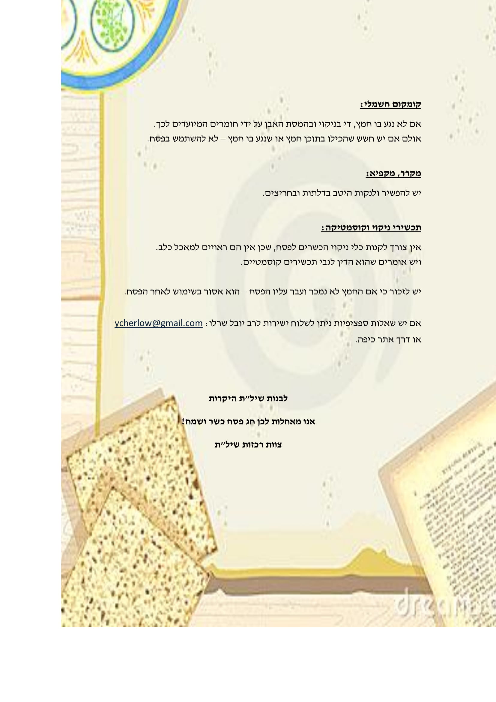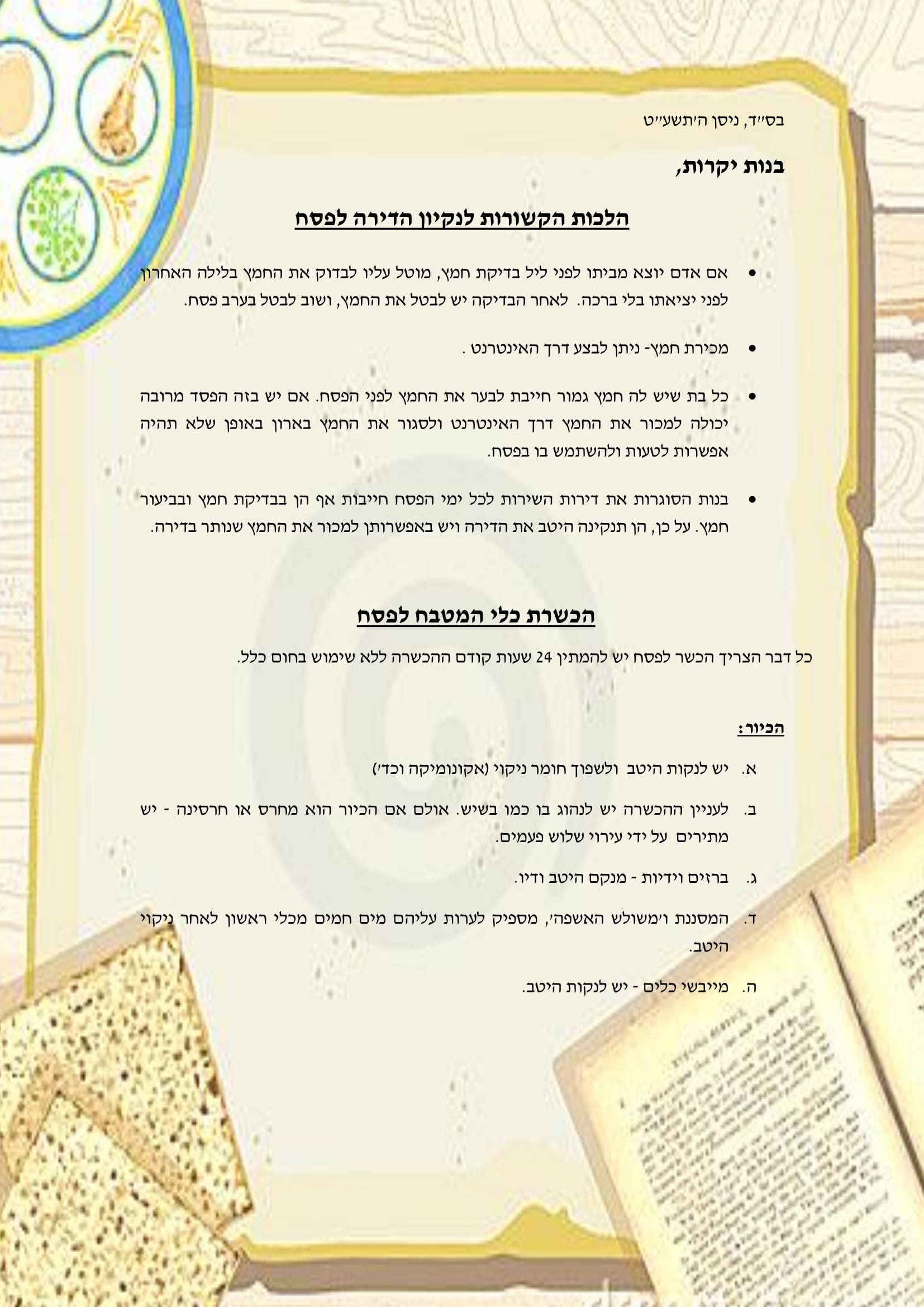 הלכות פסח להכשרת הדירהפסח מתקרב בצעדי ענק, איגדנו עבורכן את הלכות הפסח ומה לעשות לפני שאתן יוצאות לחופשת פסח.חג שמח וכשר מצוות שיל"ת!Skip back to navigation