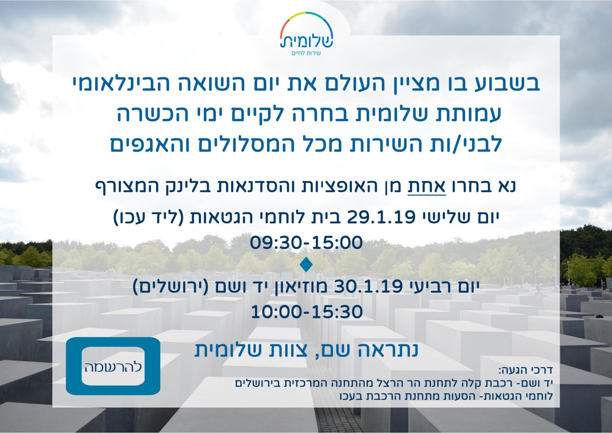 כמידי שנה, עמותת שלומית מקיימת יום עיון לציון יום השואה הבינלאומי הכולל סיור במוזיאון יד ושם או במוזיאון לוחמי הגיטאות