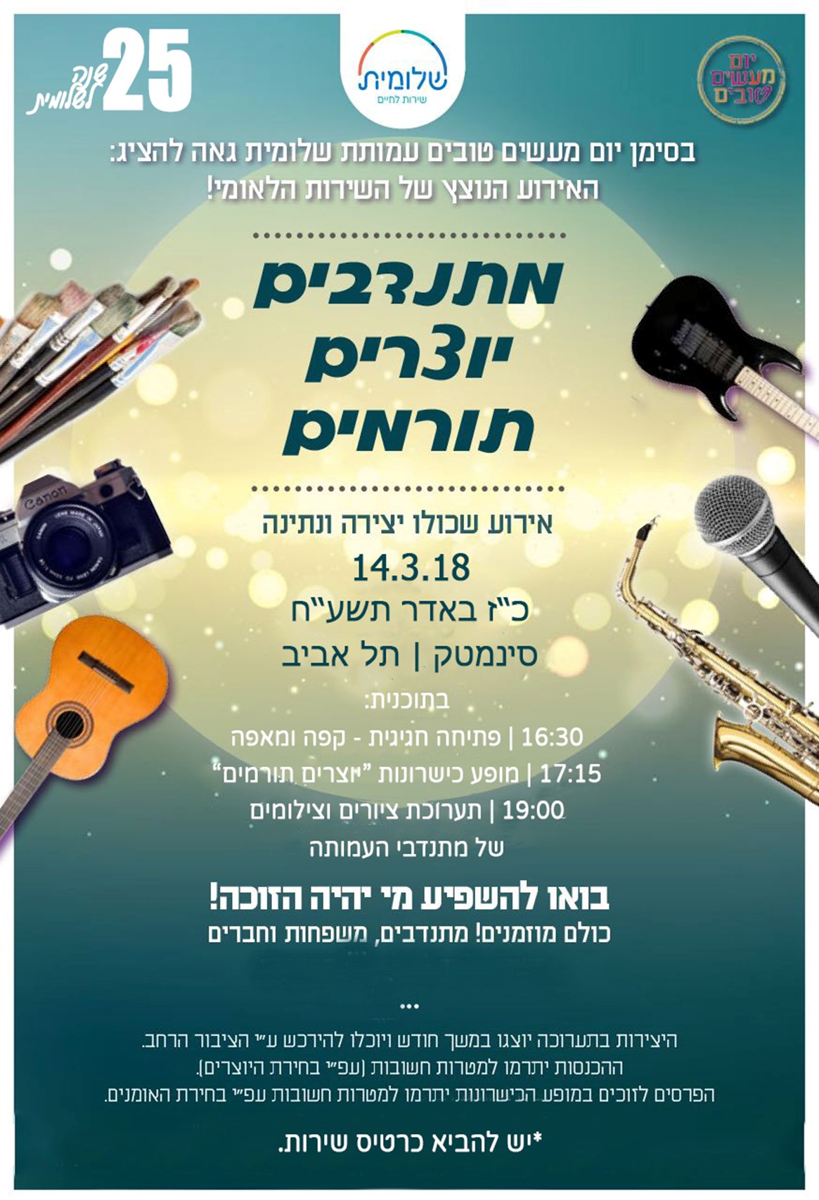 ערב מתנדבים יוצרים תורמים, בסימן 25 שנה לשלומית. ערב שכולו שלכם ובשבילכם ב14/3 בשעה 16:30 בסינמטק תל אביב.