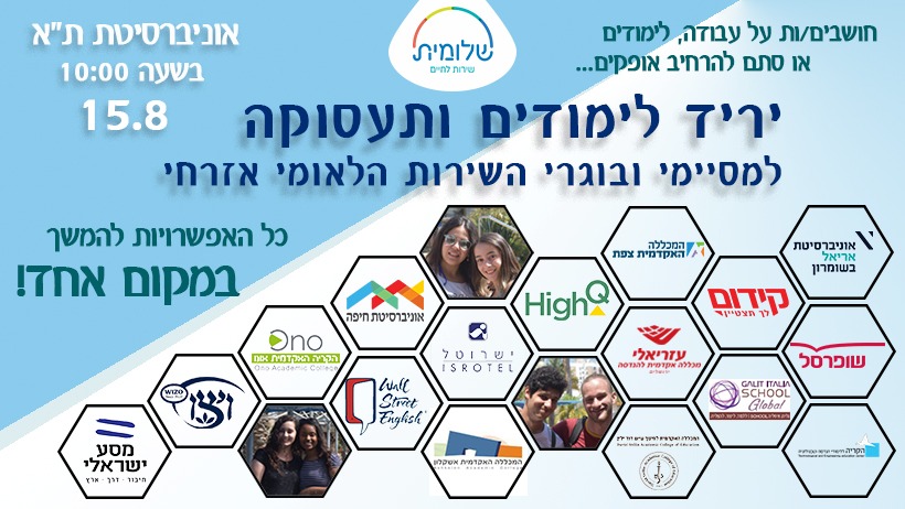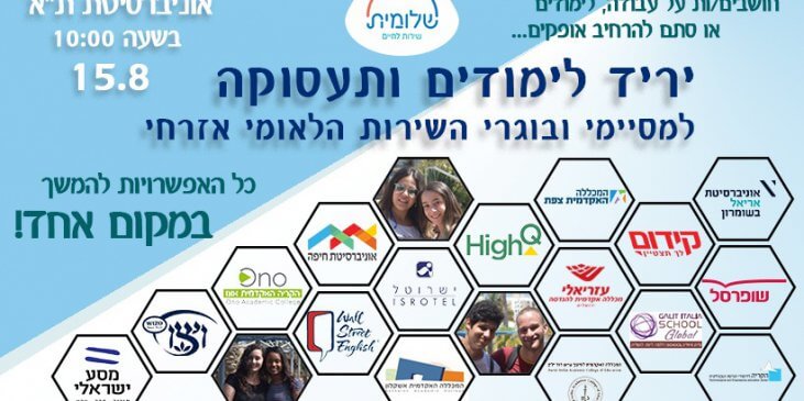 בקרוב יתקיים יריד לימודים ועבודה בו תוכלו להיחשף, לבדוק ולקבל הנחות והטבות ברישום למגוון אוניברסיטאות, מכללות, קורסים, מכינות, לימודי פסיכומטרי ואנגלית, לימודי איפור ותסרוקות, מקומות תעסוקה, עבודה מועדפת, הכוונה ועוד…