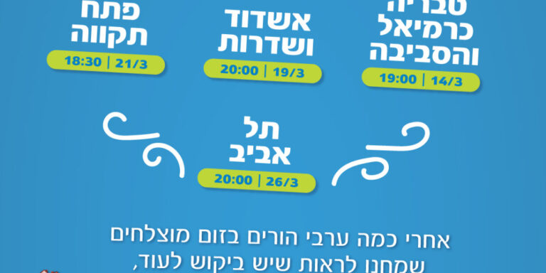 אחרי כמה ערבי הורים בזום מוצלחים שמחנו לראות שיש ביקוש לעוד, ובהתאם פתחנו תאריכים נוספים לפי ערים!