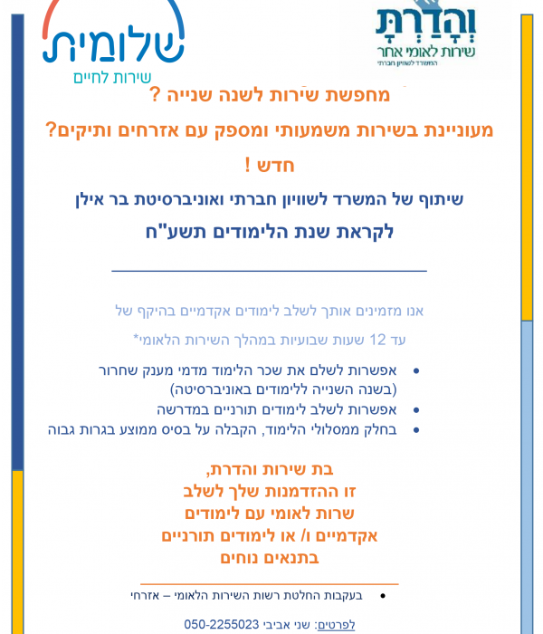 לפרטים על שירות שנה שניה בוהדרת בשילוב לימודים באוניברסיטה ניתן לפנות לשני 0502255023