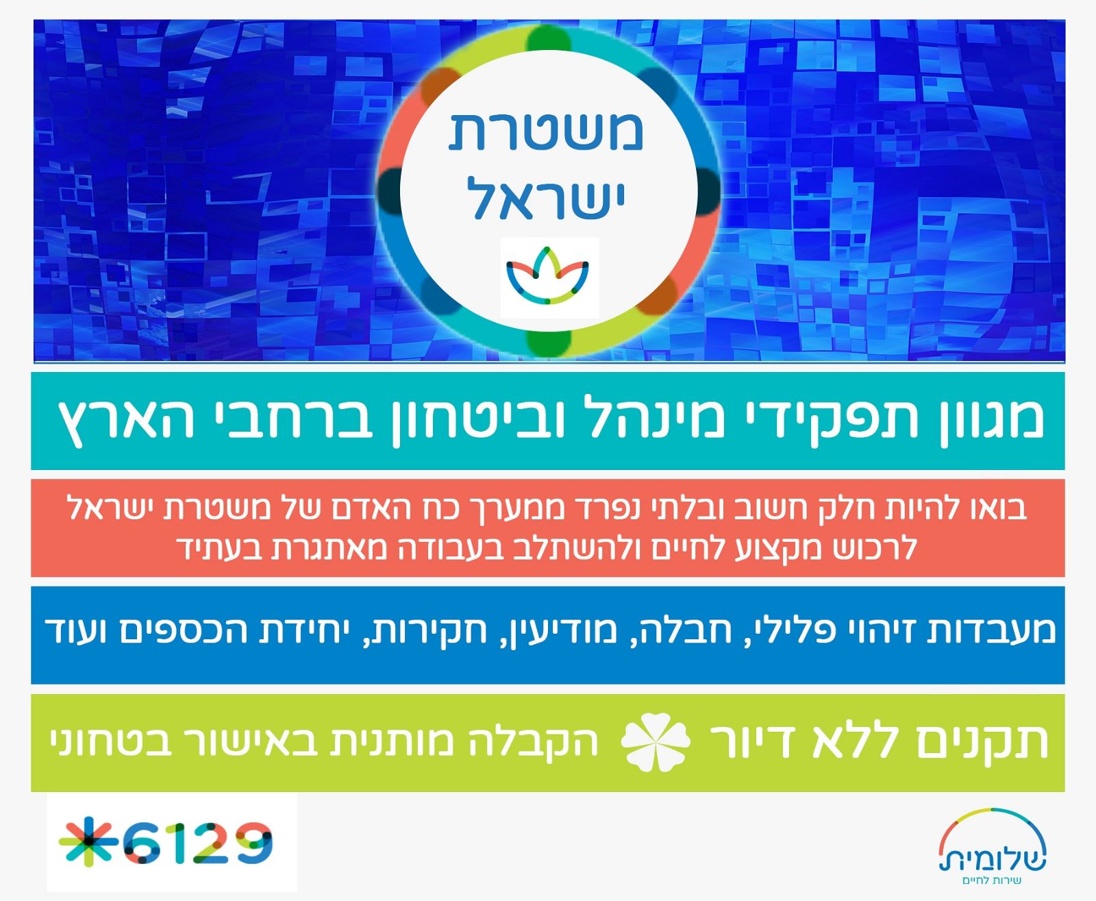 שירות לאומי במשטרת ישראל הוא שירות מאתגר וייחודי, המאפשר למשרתים בו להיות חלק מהתמיכה בשוטרי השטח הנלחמים בחזית הפשיעה והעבריינות.